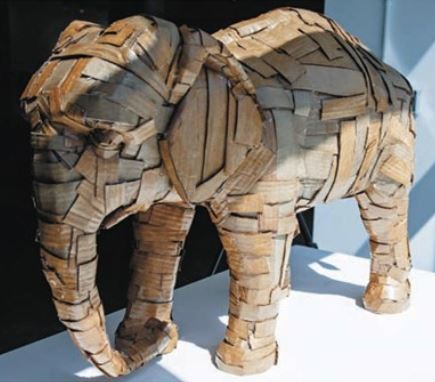I chose Laurence Vallieres’s piece called There’s an Elephant in the Trunk because it’s made with different lengths of cardboard stuck together into a patchwork pattern. The most successful aspect of this piece is that the dark cardboard makes it look heavy and sturdy. I think the least successful aspect is that the trunk is bent at an odd angle. I would like to incorporate the same type of stability into my own piece (left).